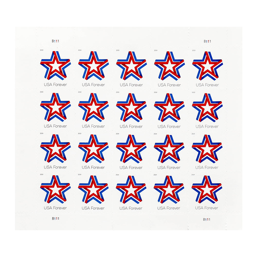 In 2019, the Postal Service will issue Star Ribbon, a Patriotic Forever stamp sold in a coil of 10,000. Offering a fresh take on patriotic stamps, the design features a digital illustration of a star made from a single red, white, and blue ribbon. The white space in the middle of the ribbon creates a second smaller star. The words Forever and USA appear below the star. The tri-colored ribbon, folded into a patriotic symbol, is intended to evoke the connectedness of the American people.