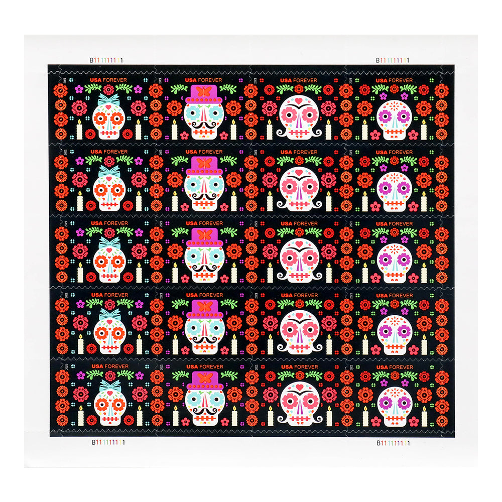 The Day of the Dead stamps are being issued as Forever stamps. These Forever stamps will always be equal in value to the current First-Class Mail one-ounce rate.