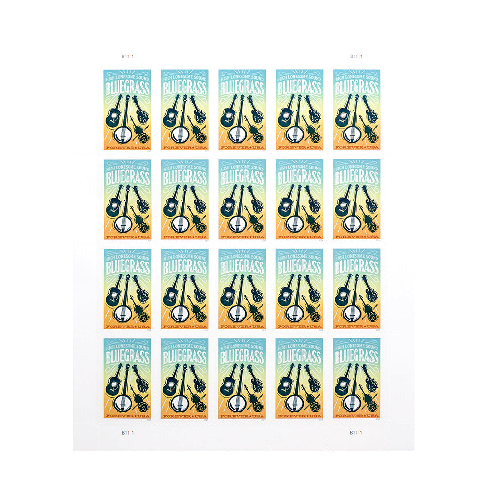 Inspired by vintage bluegrass concert posters, the stamp art features four acoustic string instruments typical of bluegrass bands: guitar, five-string banjo, fiddle, and mandolin. Text at the top of the stamp reads High Lonesome Sound, the title of a 1963 documentary about Appalachian folk music and a familiar nickname for bluegrass.